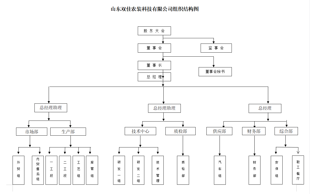 公司设董事会、监事会及经营管理层,设有生产部、质检部、市场部、供应部、综合部、技术中心及财务部七个职能部门,公司组织结构图为: